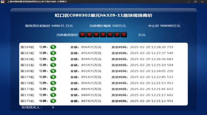 184轮竞价,金茂&庆隆联合体以总价896435万元竞得虹口C080302单元hk329-11地块,溢价率38.2%,折合楼板价117474元/㎡,装修标准不小于4000元/㎡。